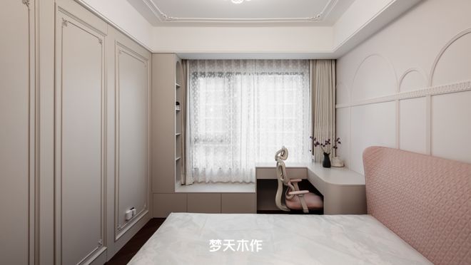女孩房注入轻法式灵魂,雕花墙面与弧形飘窗开放柜勾勒浪漫基调,一体式设计将书桌、床头柜与储物无缝衔接,兼顾美学与实用。