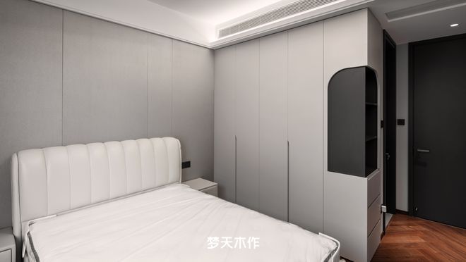 主卧以白棕拼色定调,微弧度拼接的床头墙板,以“解构”手法柔化空间边界,漾开温柔梦境。